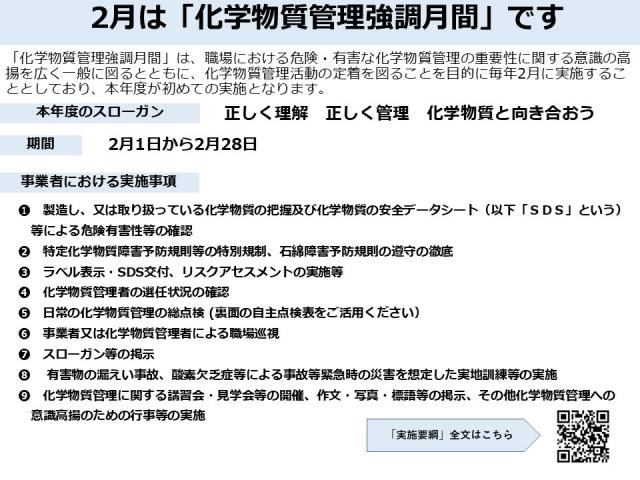 厚生労働省は令和7年2月1日から2月28日までの1か月間、「化学物質管理強調月間」を実施しています。
