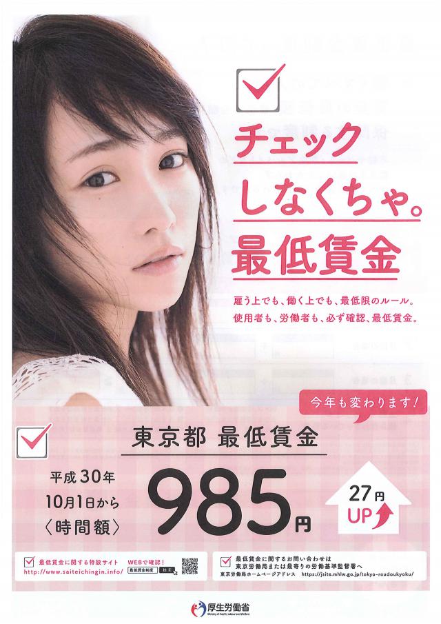 平成30年10月1日から、東京都の最低賃金(時間額)が27円アップし、985円に引き上げられます。